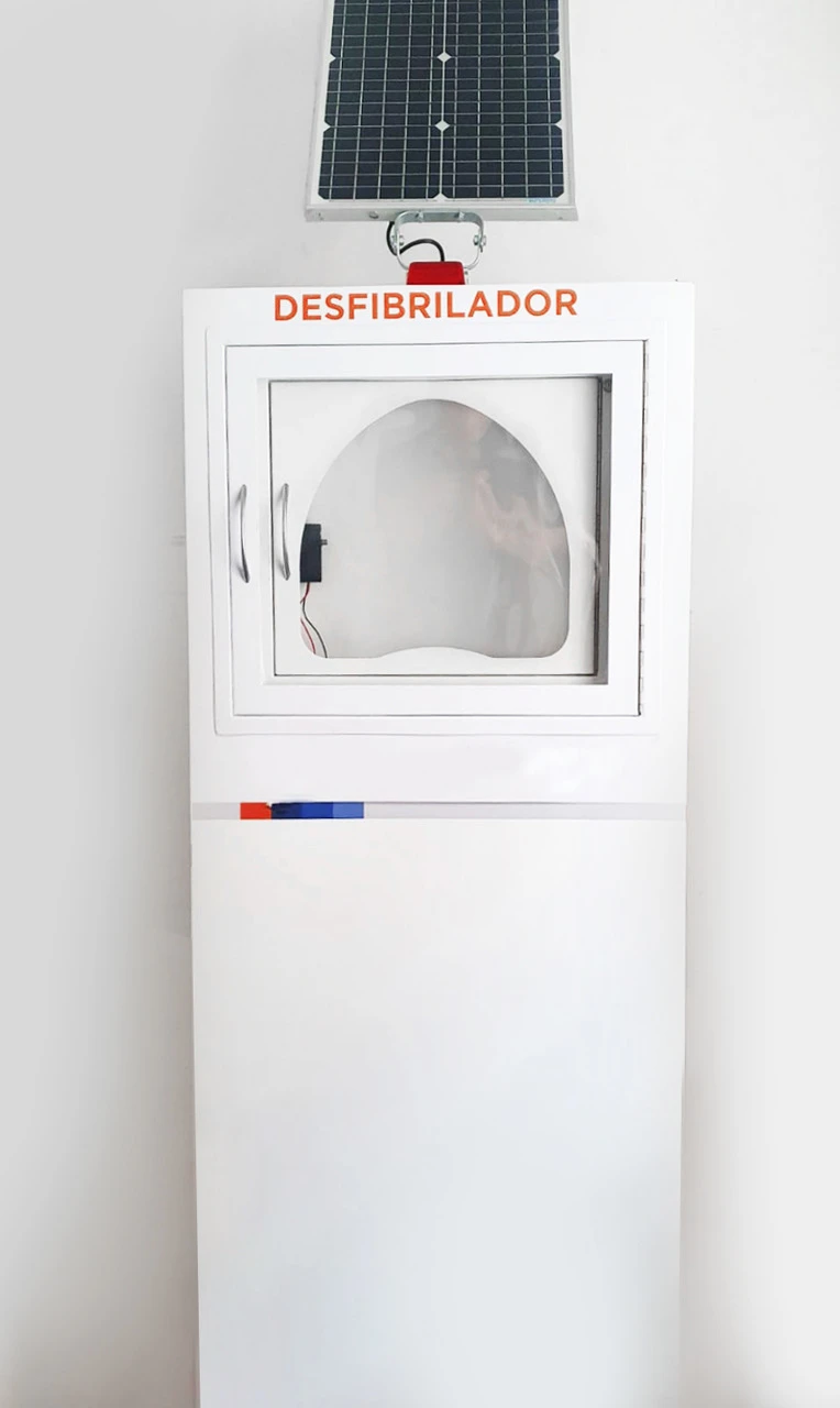 El tótem calefaccionado ha sido desarrollado para operar en zonas de bajas temperaturas para proteger los parches del desfibrilador que se deterioran con las bajas temperaturas. Se compone de dos gabinetes, uno dentro de otro, separados por una capa de 5cm. de poliuterano expandido para lograr una buena aislación, una batería de gel y un panel solar para alimentación y carga de la batería. El sistema es comandado por un módulo de control con un microprocesador y cuenta con dos sensores de temperatura de 5 y 9 grados. Cuando la temperatura dentro del gabinete llega a 5 grados, se activa el calefactor y cuando llega a 9 grados se desactiva, manteniéndose dentro de ese rango. El equipo es autónomo y no necesita alimentación externa. Durante el día el panel solar alimenta el sistema y mantiene cargada la batería y durante la noche la batería alimenta a equipo teniendo 16 horas de autonomía.
